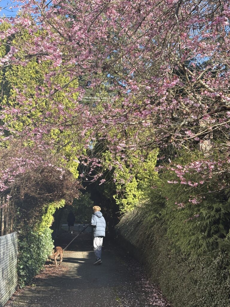 Hello friend, hope you are doing well and that these early days of spring have been good for you. In my corner of the world I can see the seasonal changes in the small bunch of daffodils and hyacinth blooming in our backyard, and in the green shoots of the lilac tree (as well as in the cherry blossoms in the above pic of my sons out walking our two dogs). Despite the sun we have right now, it remains chilly but it’s nice knowing that life is moving in a warmer direction. I did a short video the other day titled “Crappy Childhood, Try This Perspective Shift” and I shot the video directly under a nearby magnolia tree, as I wanted to show off it’s brilliant pink buds that were just starting to open. You can check out that video (and the magnolia blossoms!) HERE.