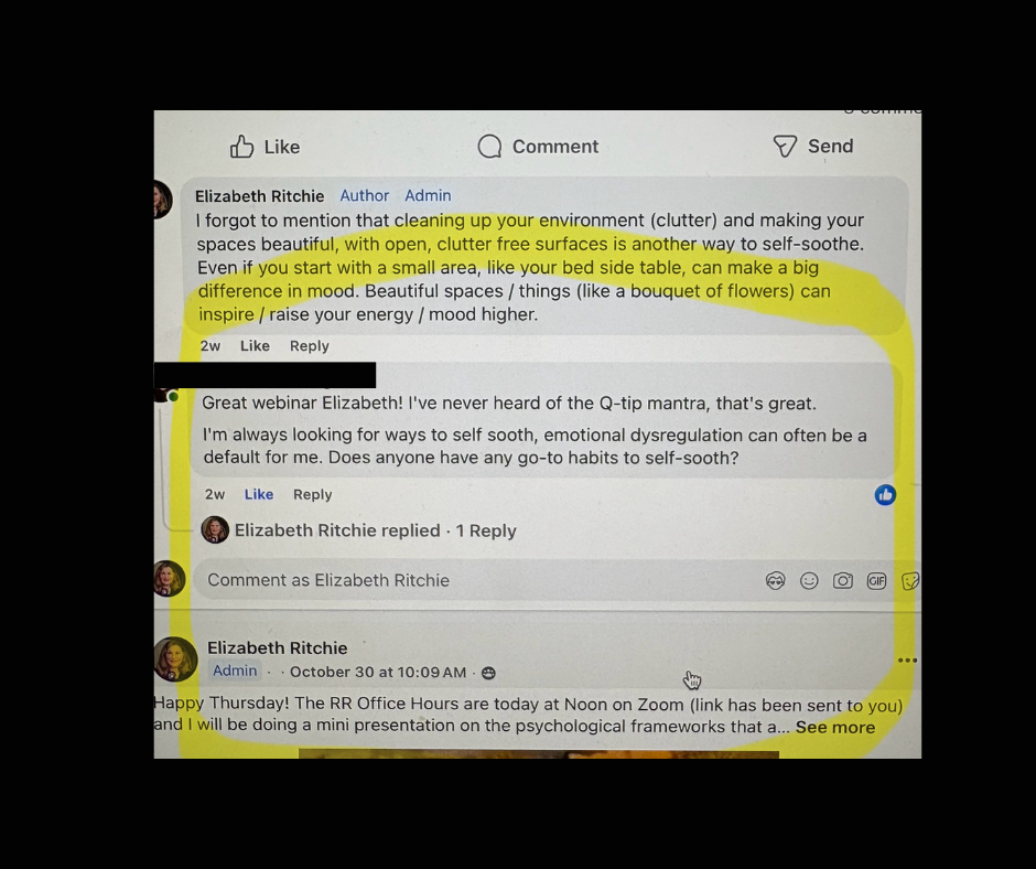 (*Should you need additional support beyond the 6, 1 hour private coaching sessions, you can get that from Elizabeth through the private FaceBook group which runs Monday to Thursday 9 -5PM (Pacific). Elizabeth is also available during the work week via Zoom, e-mail and text should something urgent arise that you need assistance with.